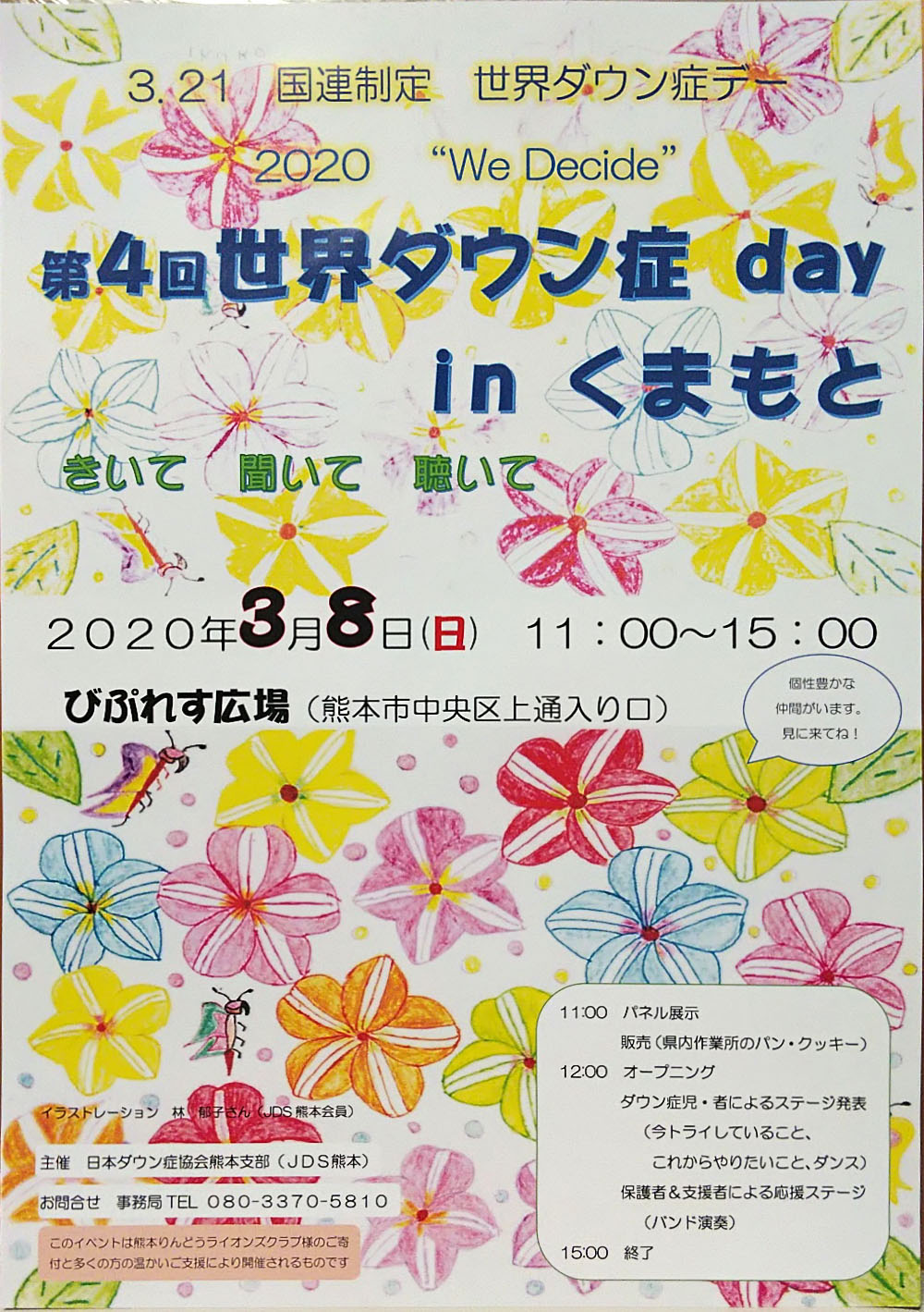 第4回世界ダウン症day in くまもと(2020年は中止) 投稿日 2020年1月27日 更新日 2026年4月27日 著者 療育委員 カテゴリー ダウン症day 今年もびぷれす広場で3月8日(日)に開催します!ぜひお立ち寄りください。今回中止いたします(2/22更新) 3月8日にびぷれす広場のビジョンで流れる予定でした。